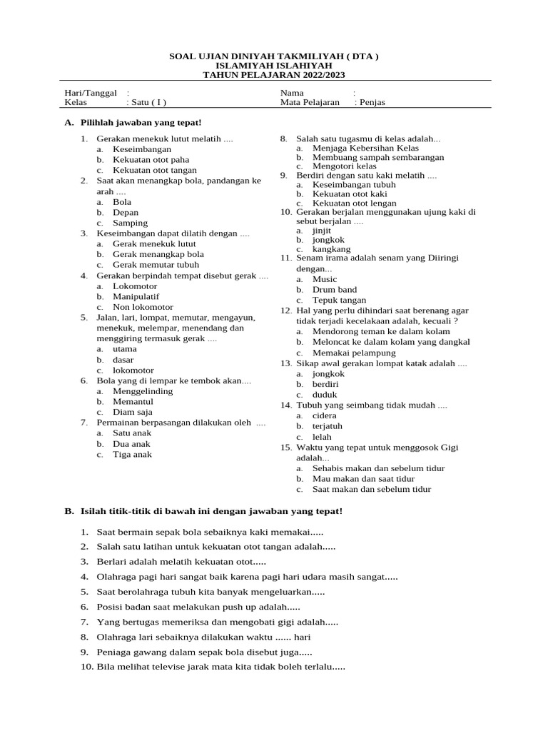 Pendidikan Jasmani, Olahraga, dan Kesehatan (Penjas) memegang peranan penting dalam tumbuh kembang anak usia dini. Melalui pelajaran Penjas, siswa kelas 1 Sekolah Dasar (SD) diajak untuk mengenal berbagai gerakan dasar, memahami pentingnya kesehatan, serta membangun kebiasaan aktif yang positif sejak dini. Untuk membantu para pendidik dan orang tua dalam memantau kemajuan belajar siswa, ketersediaan soal latihan yang relevan dan berkualitas sangatlah krusial. Artikel ini akan membahas secara mendalam mengenai cara mengunduh soal Penjas kelas 1 SD semester 1, lengkap dengan panduan, manfaat, serta tips dalam memilih soal yang tepat.